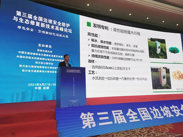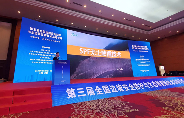 東南生態修復有限公司(以下簡稱我司),有幸受邀參加了本次大會,我司研發主任云飛揚先生就大會開幕式及專家致辭后開啟了——SPF噴播工藝為主題的主旨報告,報告首先以生態修復兩大追求“快速復綠、長久持綠”和兩大痛點“南方的強降雨沖刷、北方的強風沙侵蝕”展開,先后就高性能噴播木纖維、SPF高性能噴播基質、SPF專用噴播機三方面闡述了SPF噴播工藝的優勢和如何實現生態修復兩大追求和解決生態修復兩大痛點,配合一個個生態修復精彩案例,迎來了大會觀眾的陣陣掌聲,受到了與會專家學者的高度贊賞。